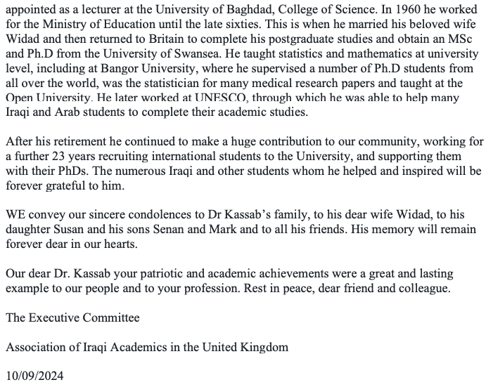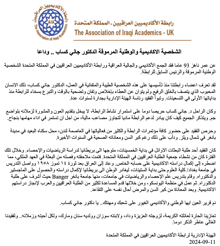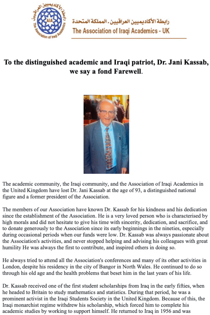 September 12, 2024September 12, 2024iraqiacademicsLeave a Comment on To the distinguished academic and Iraqi patriot, Dr. Jani Kassab we say a fond Farewell. To the distinguished academic and Iraqi patriot, Dr. Jani Kassab we say a fond Farewell. Share this: Click to share on X (Opens in new window) X Click to share on Facebook (Opens in new window) Facebook Click to share on WhatsApp (Opens in new window) WhatsApp Click to email a link to a friend (Opens in new window) Email Like Loading...
